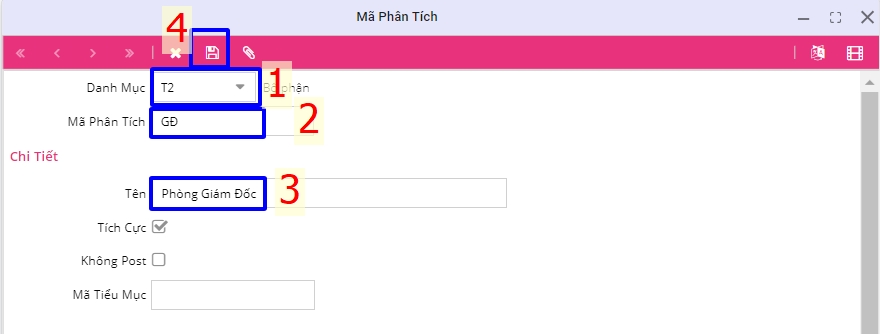 Trường hợp 2: Nếu chưa định nghĩa hoặc muốn thêm các danh mục phân tích khác, người dùng cần tạo các danh mục phân tích từ T0 - T9. Các mã phân tích này được lưu trong các trường tương ứng anal_t0 - anal_t9 trong sổ nhật ký chung.
