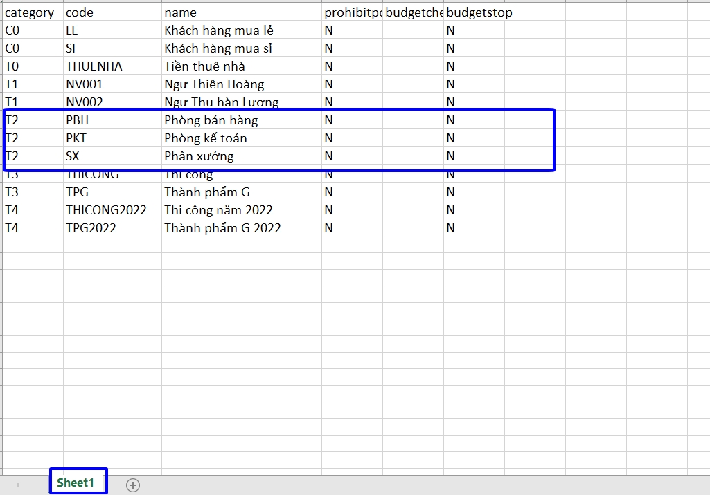 Trong file này, người dùng đang cần sử dụng bộ phận T2, bỏ các dòng T1, T3, T4. Lưu ý: Sheet dữ liệu phải là sheet đầu tiên và thứ tự các cột không thay đổi. Người dùng có thể thêm các sheet ở phía sau, dùng công thức cho sheet dữ liệu đầu tiên. Sau khi nhập liệu đầy đủ dữ liệu, người dùng Inport