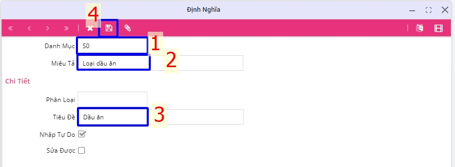 Người dùng vào Menu > Thiết Lập Chung > Phân Tích > Định Nghĩa, và nhấp vào biểu tượng dấu + để thêm danh mục phân tích:
