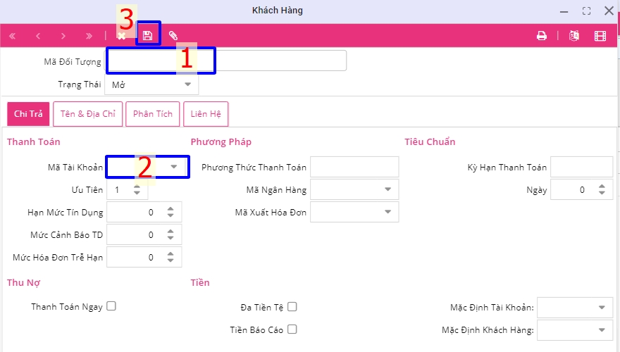 Tab chi trả: điền mã đối tượng và mã tài khoản, còn các thông tin khác tùy theo nhu cầu của từng doanh nghiệp sẽ điền thêm vào.