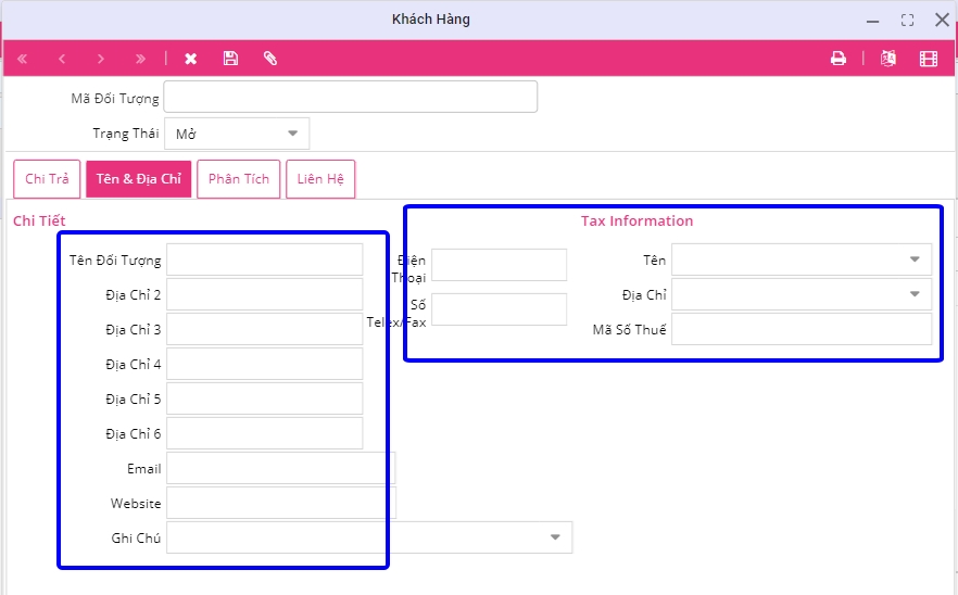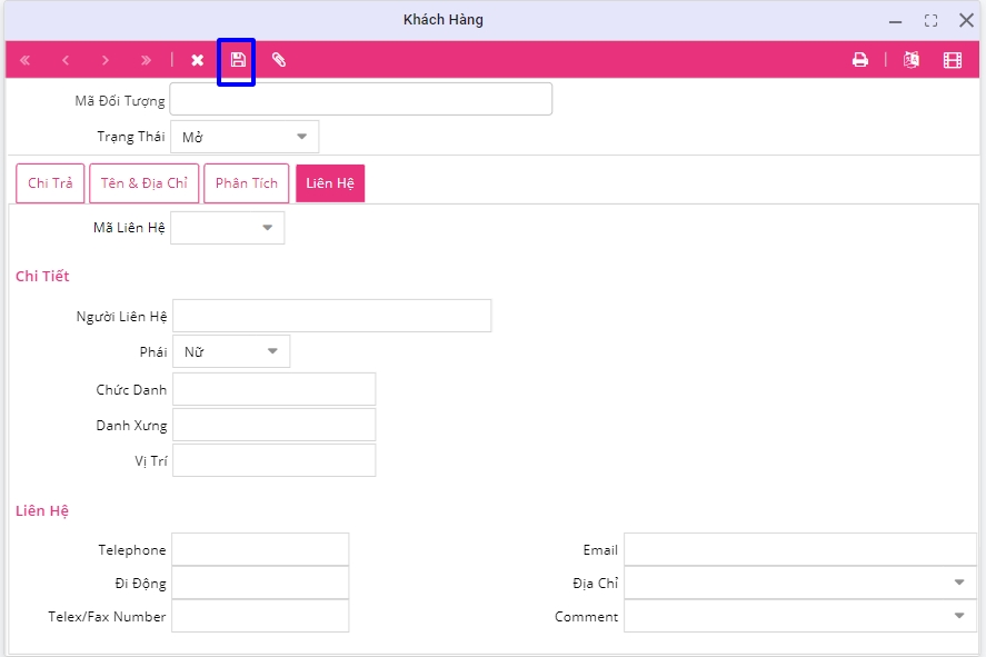 Tab liên hệ: người dùng điền thông tin liên hệ của Khách Hàng/Nhà Cung Cấp.