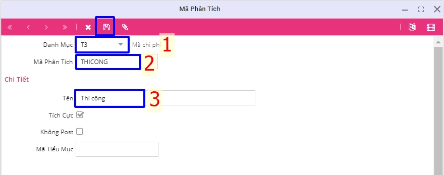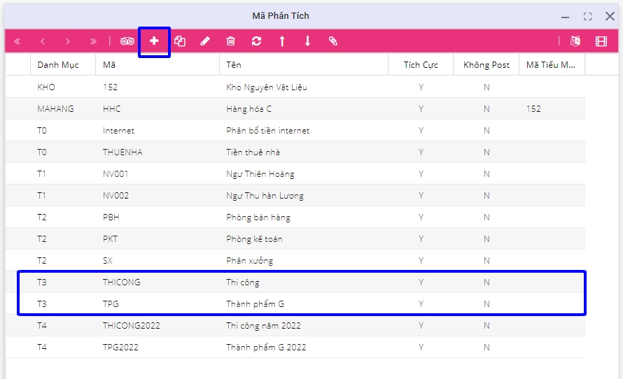 Trường hợp 2: Nếu chưa định nghĩa hoặc muốn thêm danh mục phân tích khác, người dùng phải tạo danh mục phân tích từ T0 - T9. Các mã phân tích này được lưu trong các trường tương ứng anal_t0 - anal_t9 trong sổ nhật ký chung.