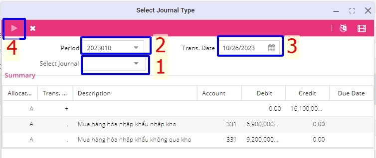 Mục 1: Select Journal (loại nghiệp vụ): người dùng chọn loại nghiệp vụ phù hợp với nhu cầu của mình.