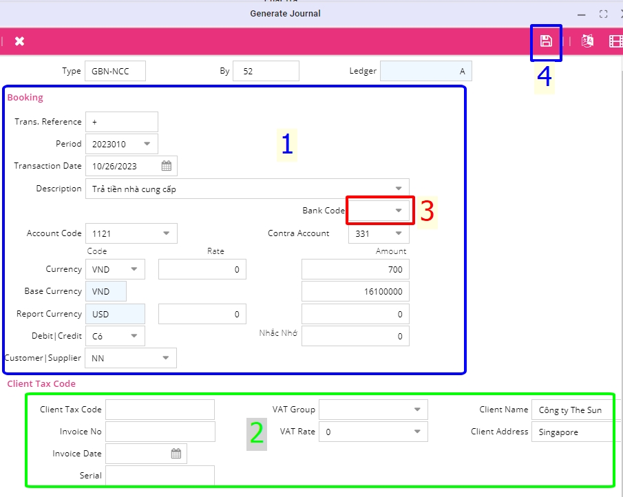 Người dùng kiểm tra lại thông tin của chứng từ cần thanh toán chính xác và điền thêm thông tin còn thiếu vào. Nếu thanh toán bằng tiền gửi ngân hàng nhập mã ngân hàng vào Bank Code.
