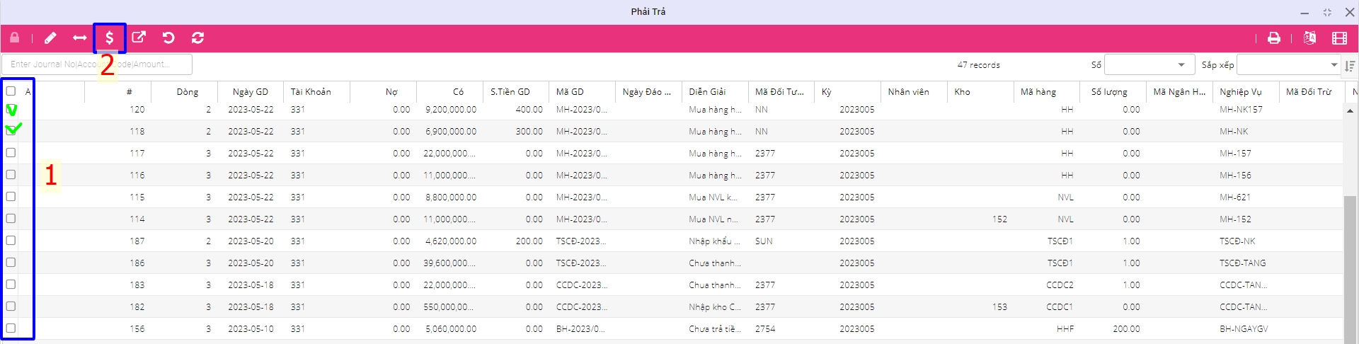 Sau đó, tích chọn vào mục cần thanh toán ở ô 1 và bấm nút