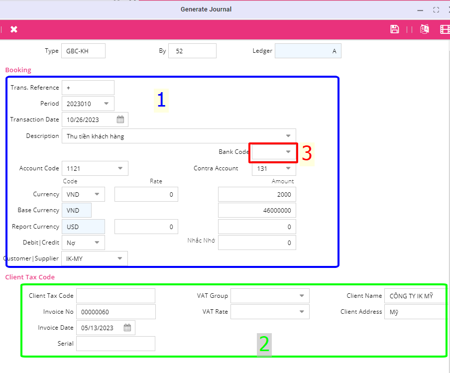 Người dùng kiểm tra lại thông tin của chứng từ cần thu tiền chính xác và điền thêm thông tin còn thiếu vào. Nếu thu bằng tiền gửi ngân hàng nhập mã ngân hàng vào Bank Code.