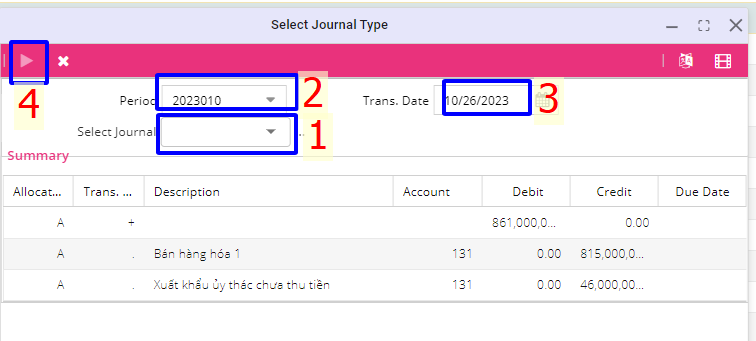 Mục 1: Select Journal (loại nghiệp vụ): người dùng chọn loại nghiệp vụ phù hợp với nhu cầu của mình.