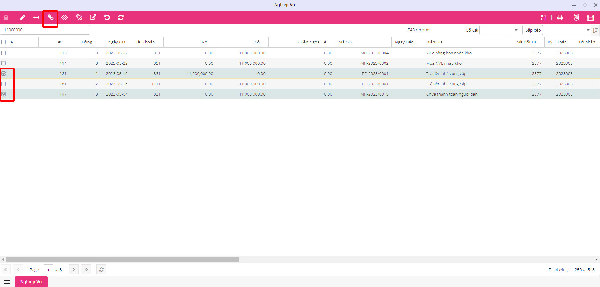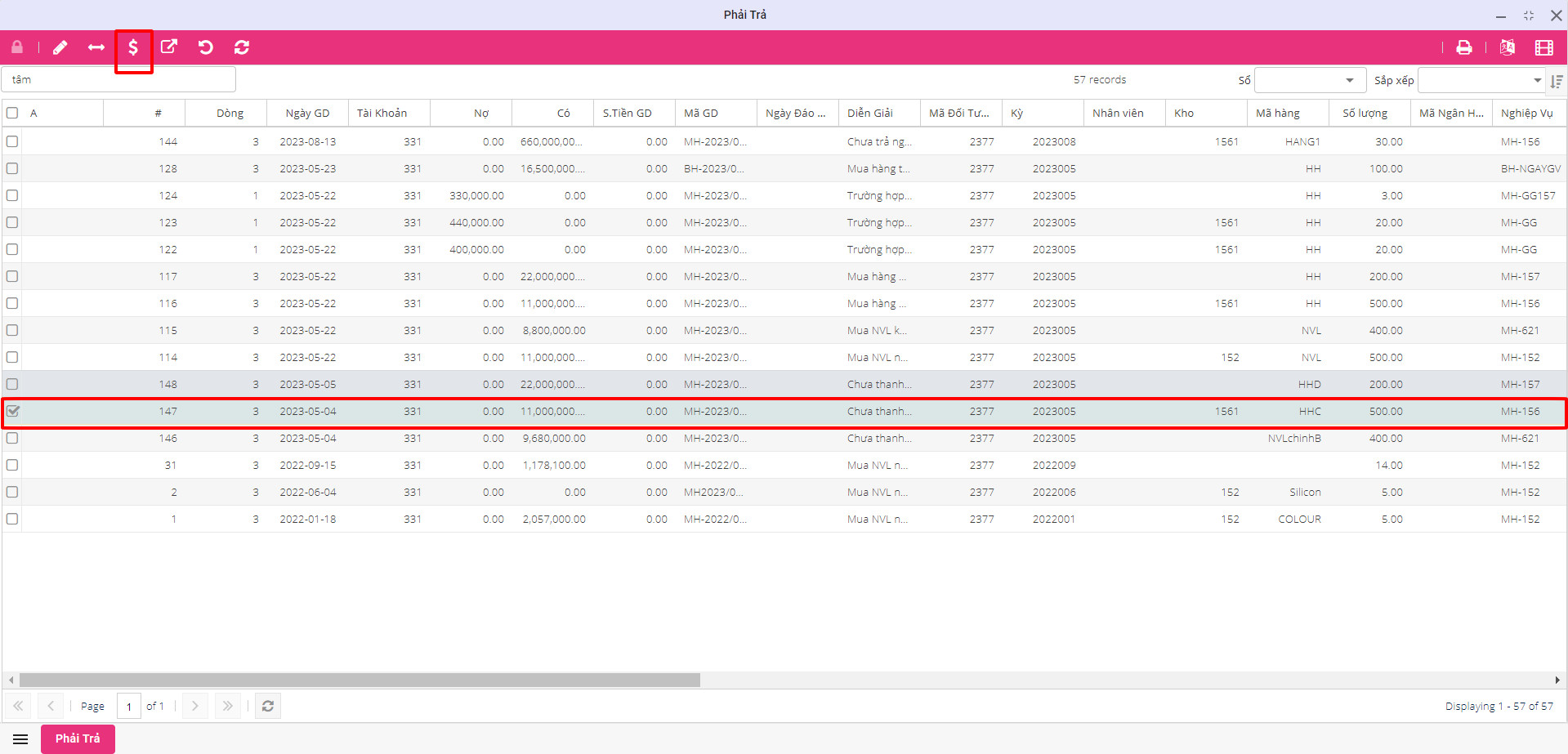Để nhập liệu chứng từ này, người dùng vào Truy Vấn ==> Phải trả, tick chọn vào nghiệp vụ cần thanh toán ==> bấm nút thanh toán