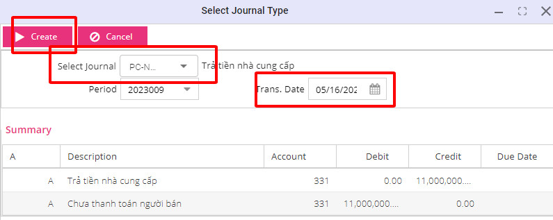 Select Journal: Chọn phiếu hạch toán trả tiền