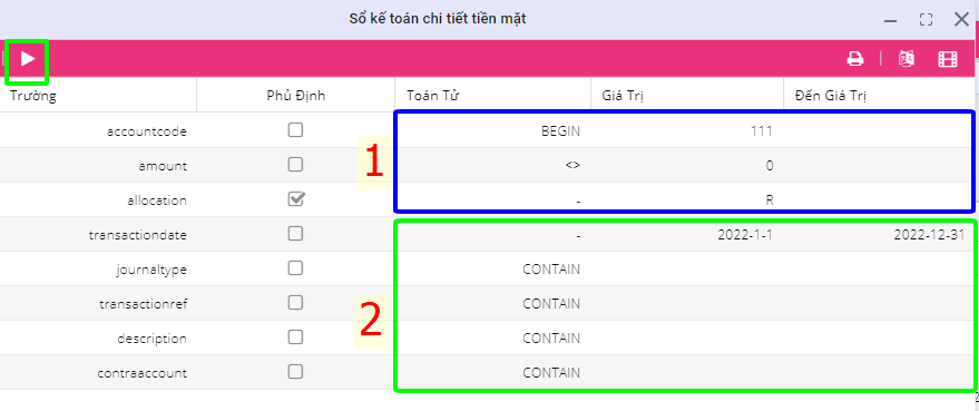 Dòng journaltype: lọc theo loại nghiệp vụ - nhập loại nghiệp vụ cần lọc vào cột Giá Trị.