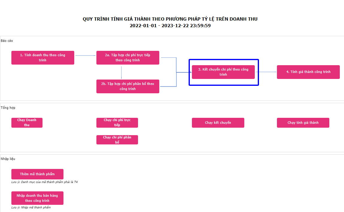 Để chạy báo cáo, người dùng vào Menu -> Giá thành -> Quy trình tính giá thành theo doanh thu, Bấm nút ➤ (Run ) , xuất hiện giao diện sau: