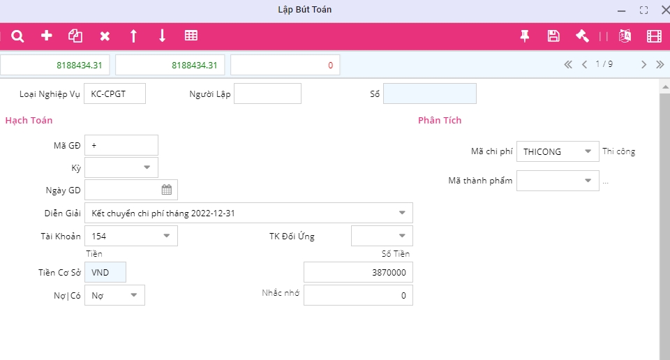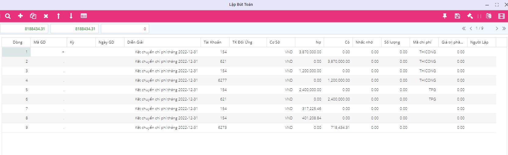 Sau đó, người dùng chỉ cần bấm vào nút kết chuyển để hạch toán kết chuyển chi phí trong kỳ, xuất hiện giao diện sau: