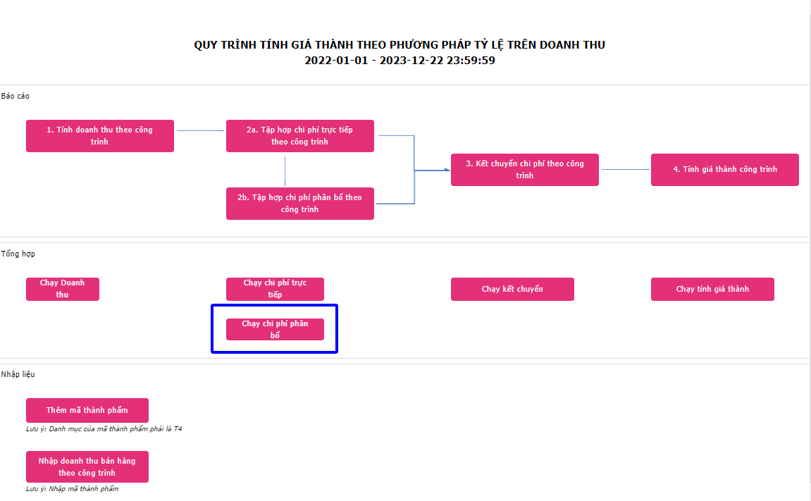 Hoặc người dùng có thể thay đổi tùy chọn ngày tập hợp chi phí, vào Giá thành -> Quy trình tính giá thành theo doanh thu, Bấm nút ➤ (Run ) , sau đó bấm vào nút Chạy chi phí phân bổ, xuất hiện giao diện sau: