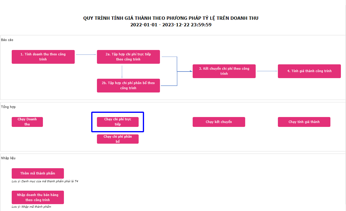 Hoặc người dùng có thể thay đổi tùy chọn ngày tập hợp chi phí, vào Giá thành -> Quy trình tính giá thành theo doanh thu, Bấm nút ➤ (Run ) , sau đó bấm vào nút Chạy chi phí trực tiếp, xuất hiện giao diện sau: