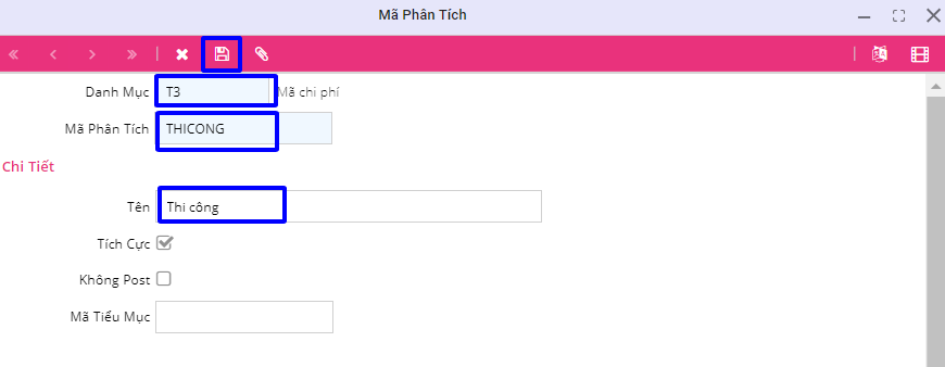 Sau khi nhập thông tin và dòng danh mục, mã phân tích, tên, bấm nút lưu: