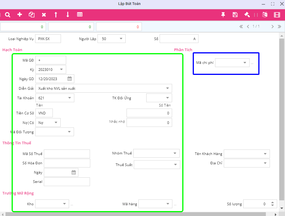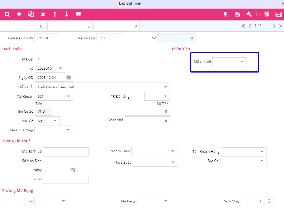 Các dòng bút toán nhập chi phí cần nhập thông tin mã chi phí. Lưu ý: Khi nhập các bút toán liên quan đến tài khoản TK 621, 622, 627 cần phải nhập mã chi phí vào.