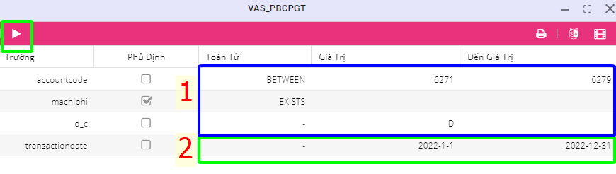 Dòng accountcode: Chỉ lấy những dòng có số tài khoản từ TK 6271 đến TK 6279 từ sổ nhật ký chung.