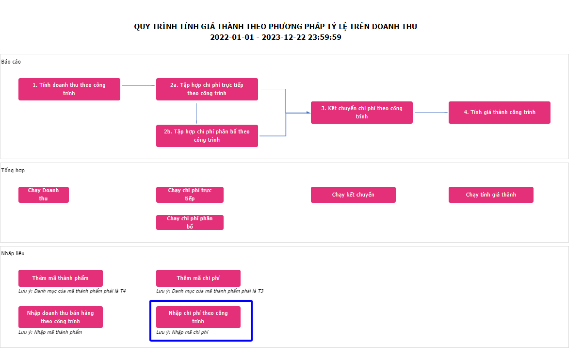 Hoặc người dùng có thể vào Menu -> Giá Thành -> Quy trình tính giá thành theo doanh thu, Bấm nút ➤ (Run ) , sau đó bấm nút Nhập chi phí theo công trình xuất hiện giao diện sau:
