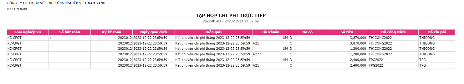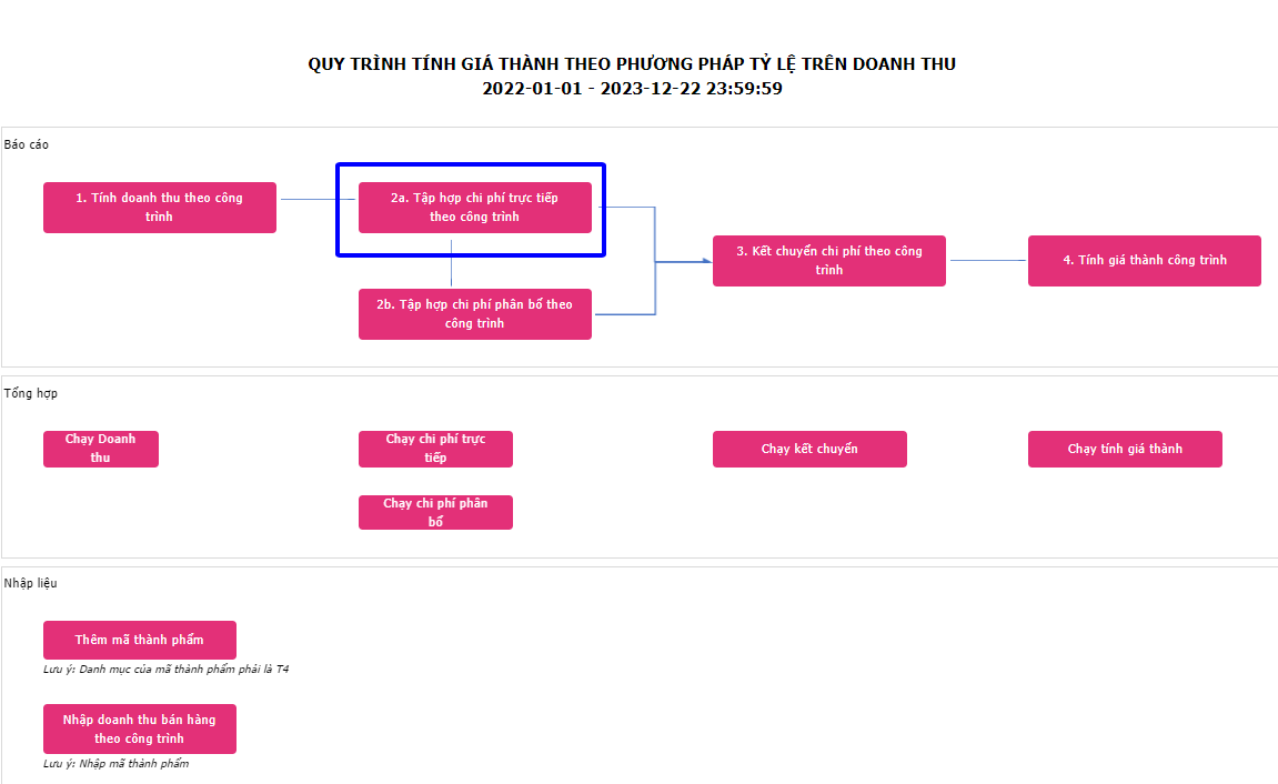 Người dùng bấm vào ô số 2a. Tập hợp chi phí trực tiếp theo công trình