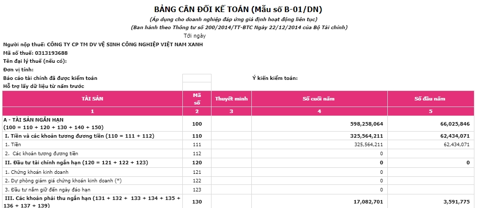 Vào Menu -->Báo cáo tài chính --> Bảng cân đối kế toán, phần mềm xuất hiện như sau:
