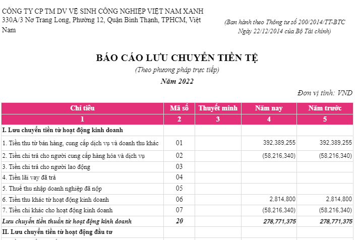 Vào Menu -->Báo cáo tài chính --> Lưu chuyển tiền tệ trực tiếp, phần mềm xuất hiện như sau: