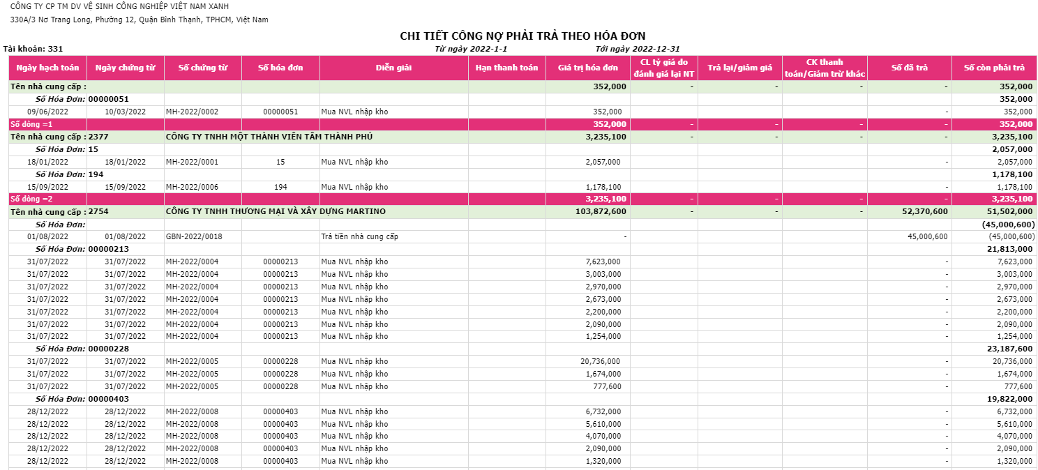 Sổ chi tiết công nợ phải trả theo hóa đơn