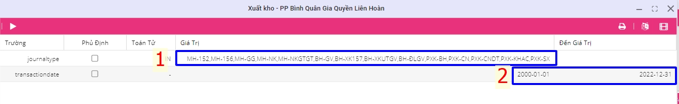 Dòng journaltype: Chỉ lấy những dòng có loại nghiệp vụ: MH-152, MH-156, ... (các nghiệp vụ mua hàng và giá vốn bán hàng) từ sổ nhật ký chung.