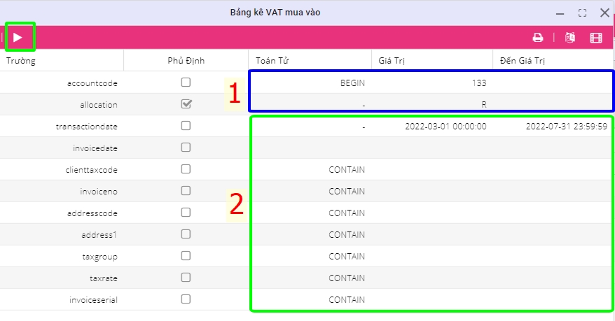 Dòng invoicedate: lọc theo ngày hóa đơn - nhập ngày hóa đơn cần lọc vào cột Giá Trị