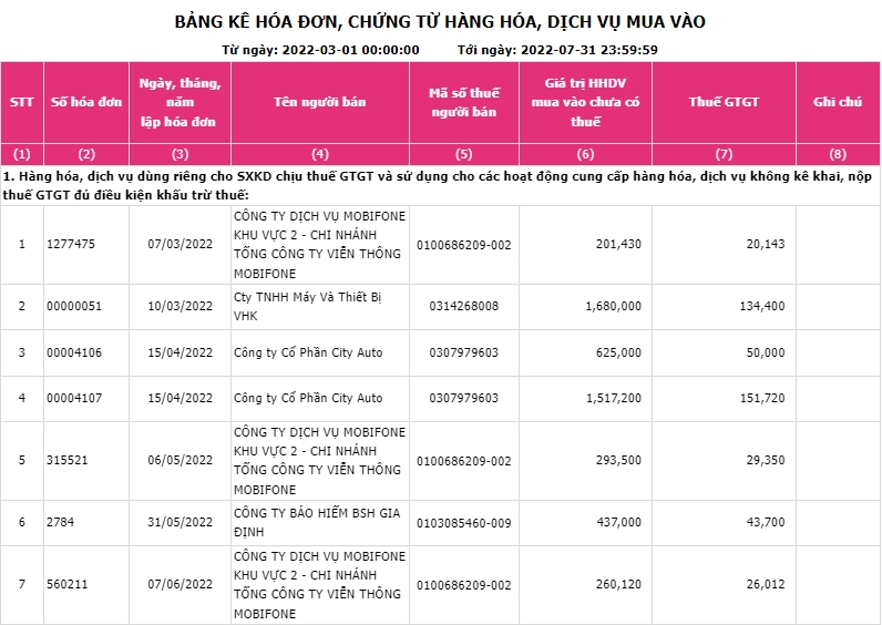 Dùng kê khai tất cả các hóa đơn của hàng hóa, dịch vụ mua vào.