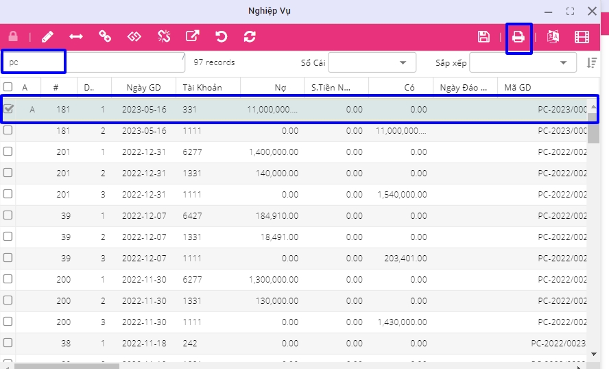Bước 2: Tick chọn chứng từ cần in bấm nút