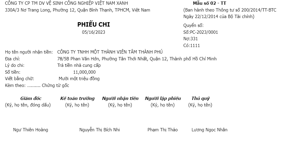 Phiếu Chi của doanh nghiệp xuất hiện như sau: